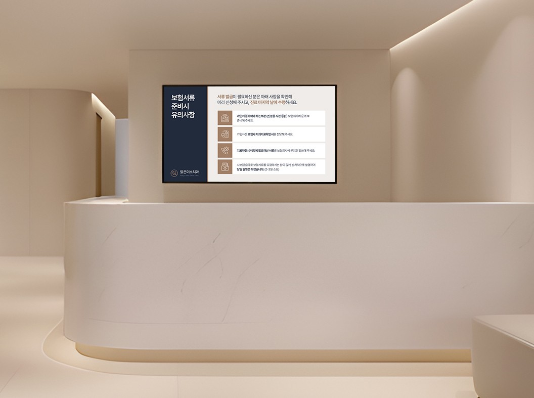 로고부터 명함, 서식지, 실내 디지털 사이니지까지. 모든 시각적 요소에 병원의 철학을 일관되게 담아내어, 환자에게 변치 않는 신뢰의 이미지를 각인시킵니다.
